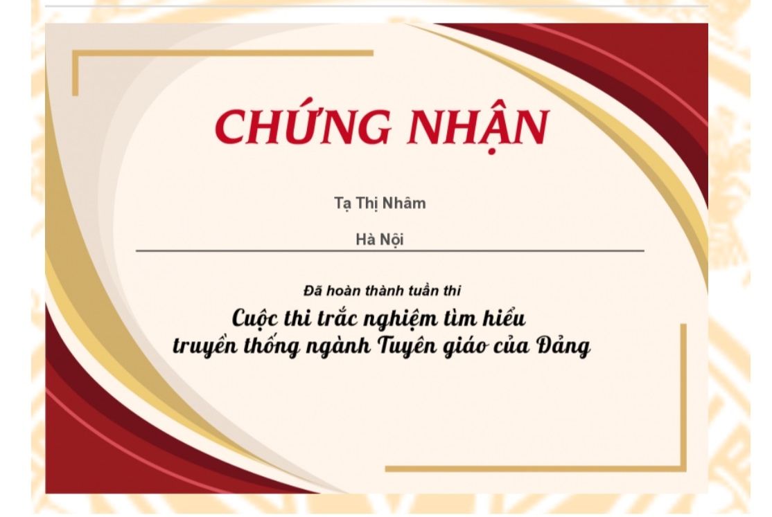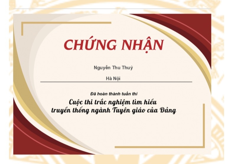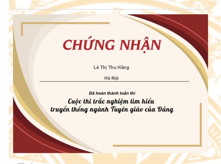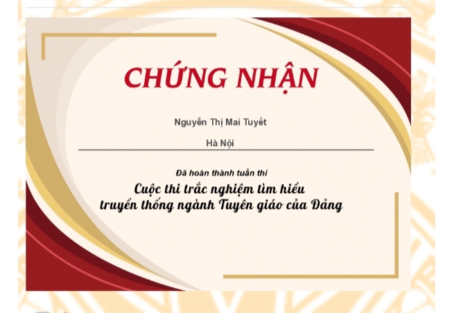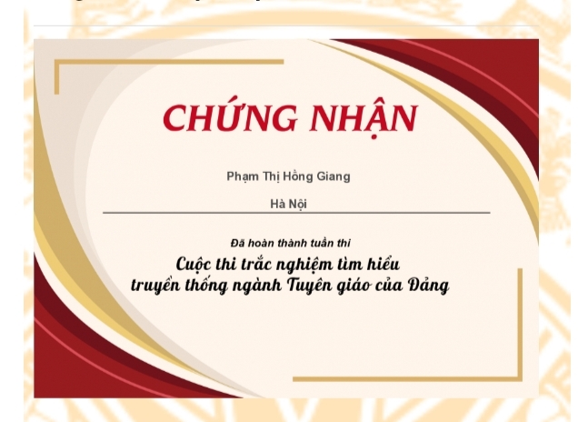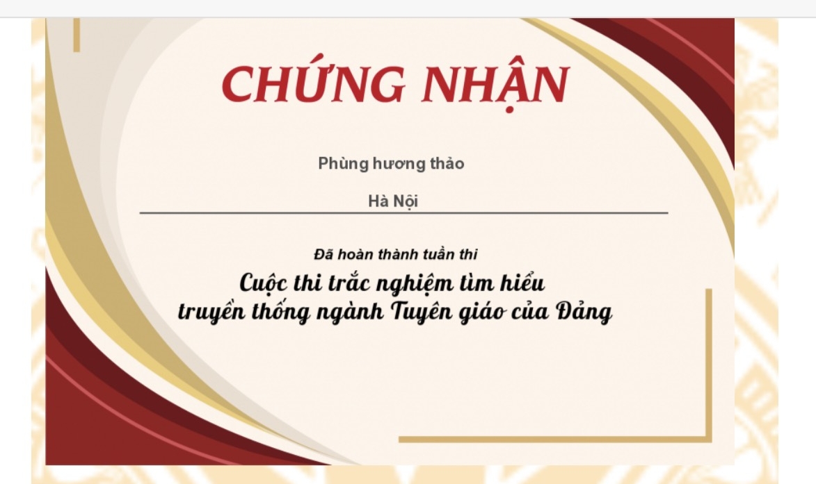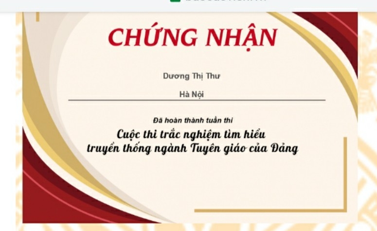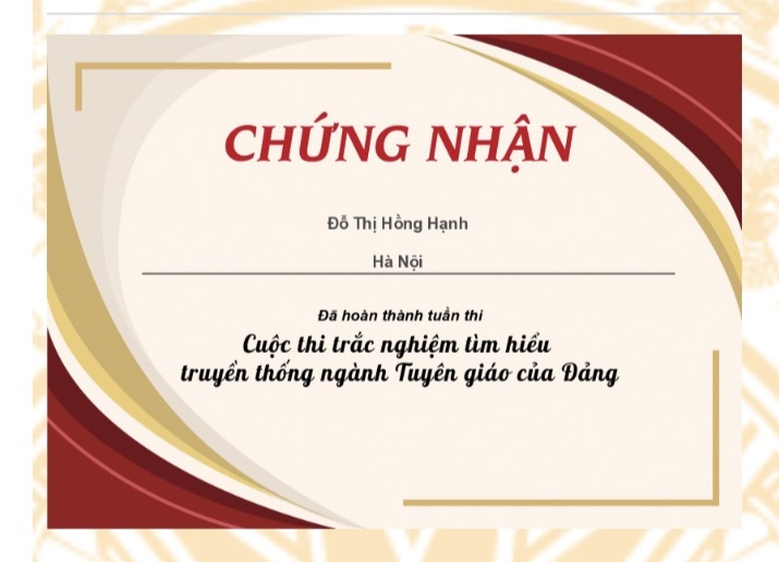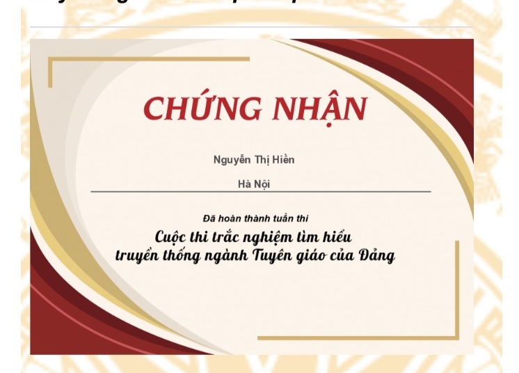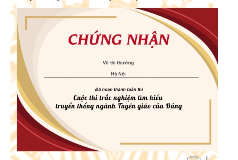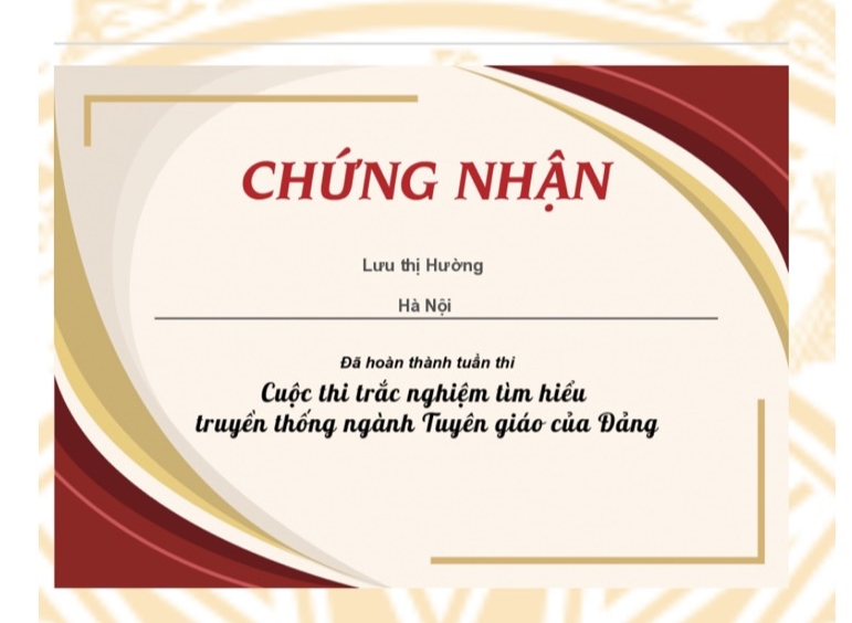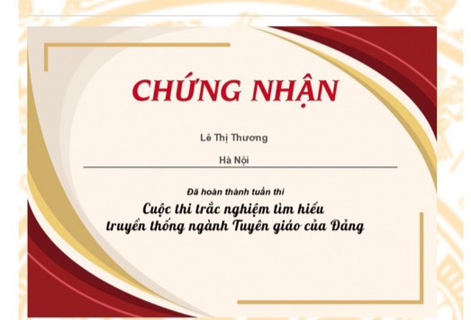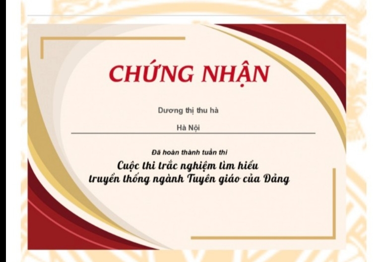 Nhân dịp kỷ niệm 93 năm Ngày truyền thống công tác Tuyên giáo của Đảng (01/8/1930 - 01/8/2023). Cán bộ, giáo viên, nhân viên Trường Mầm Non La Khê tích cực hưởng ứng tham gia Cuộc thi trắc nghiệm tìm hiểu truyền thống Ngành Tuyên giáo của Đảng. Tập thể CBGVNV nhà trường đã hưởng ứng tham gia cuộc thi và nhận được những tấm giấy chứng nhận đã hoàn thành tuần 3 của cuộc thi.
