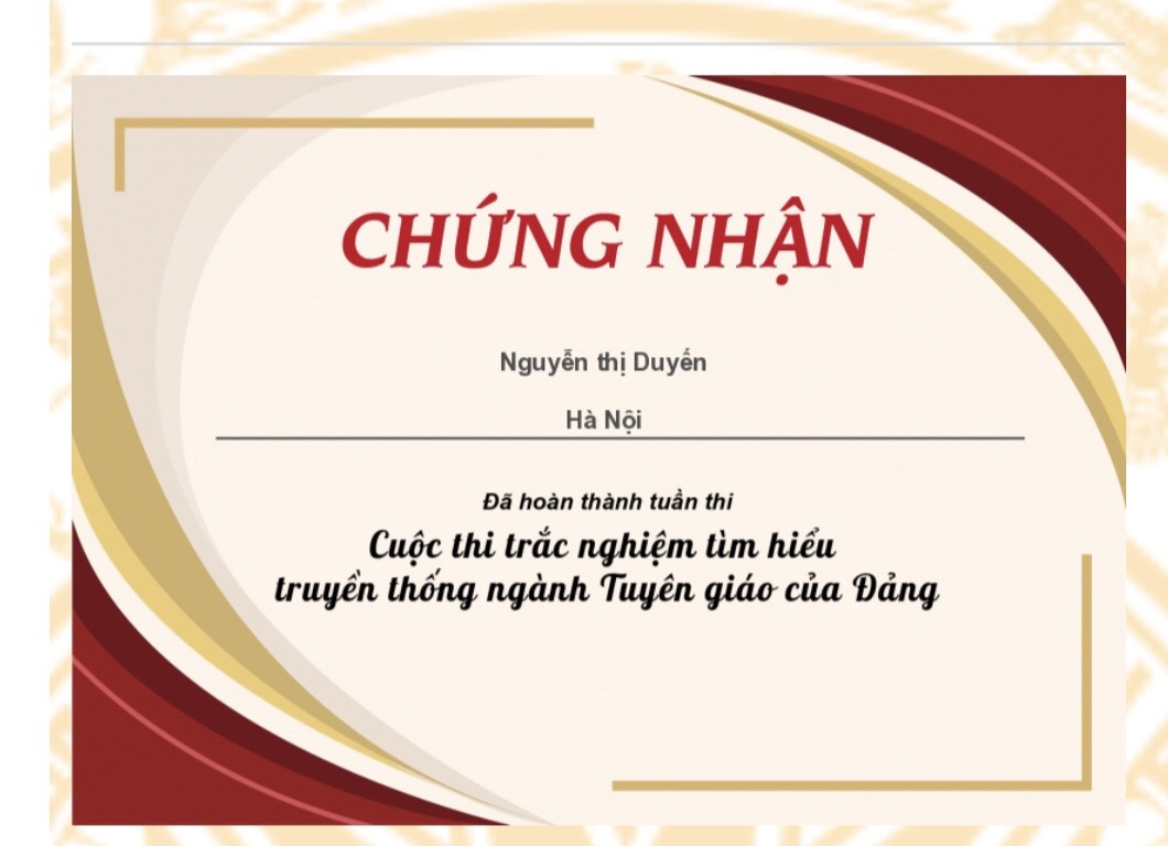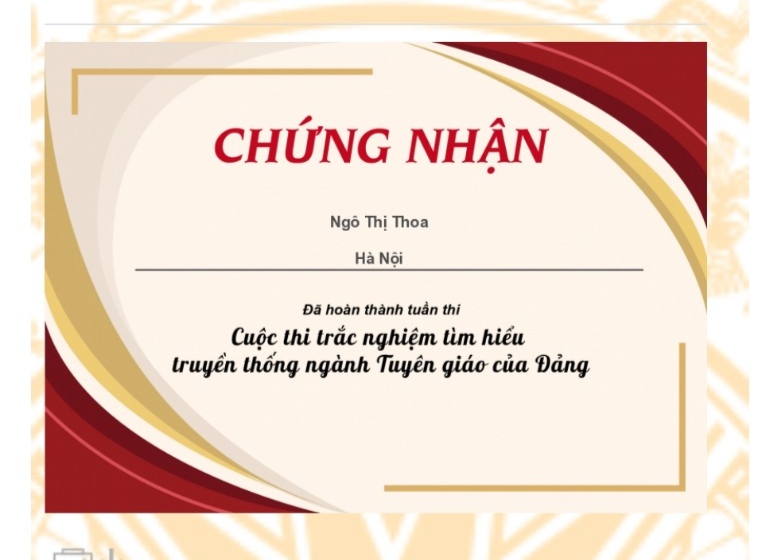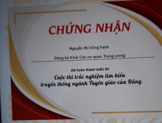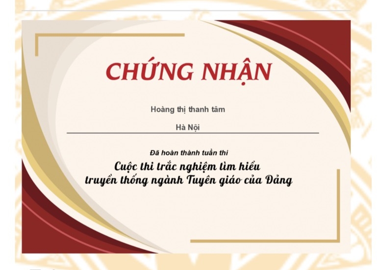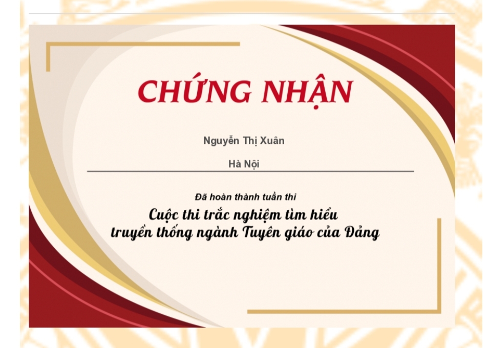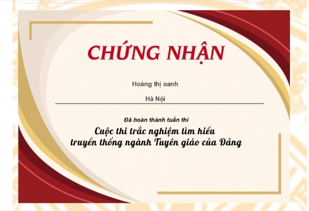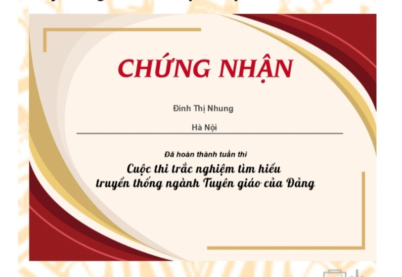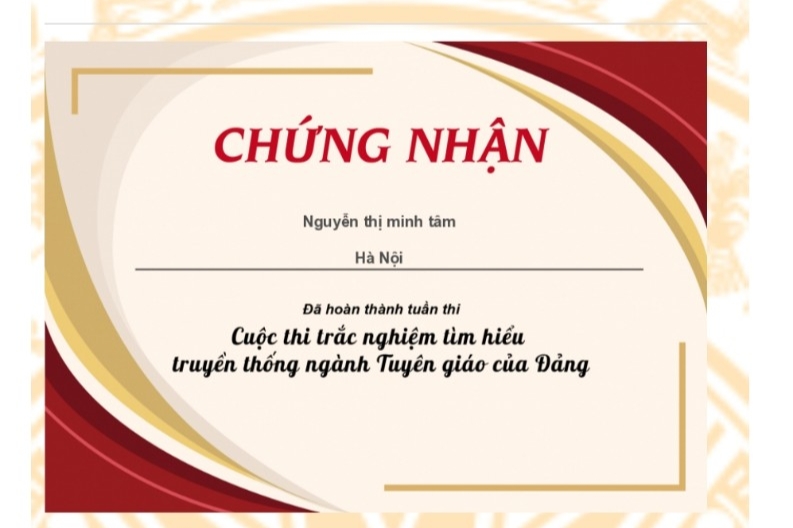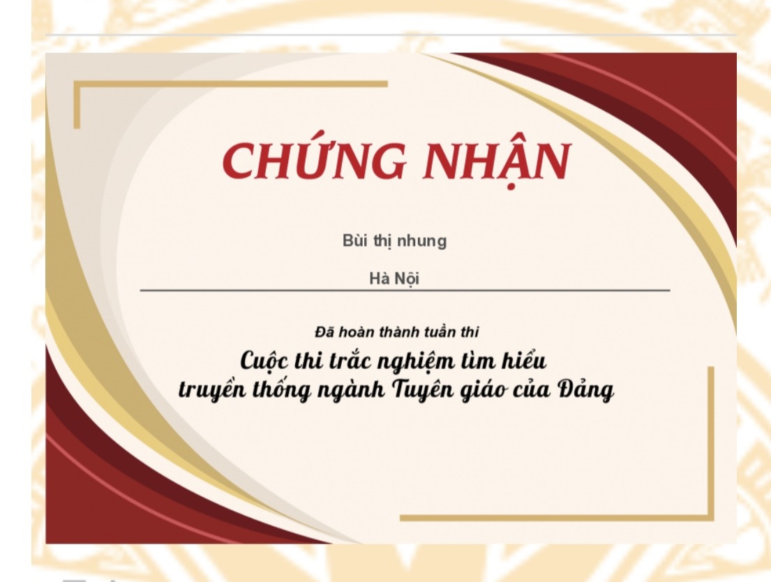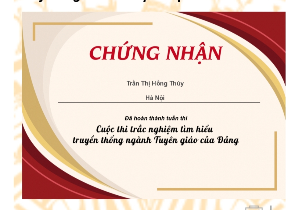 Nhân dịp kỷ niệm 93 năm Ngày truyền thống công tác Tuyên giáo của Đảng (01/8/1930 - 01/8/2023). Cán bộ, giáo viên, nhân viên Trường Mầm Non La Khê tích cực hưởng ứng tham gia Cuộc thi trắc nghiệm tìm hiểu truyền thống Ngành Tuyên giáo của Đảng. Tập thể CBGVNV nhà trường đã hưởng ứng tham gia cuộc thi và nhận được những tấm giấy chứng nhận đã hoàn thành tuần 3 của cuộc thi.