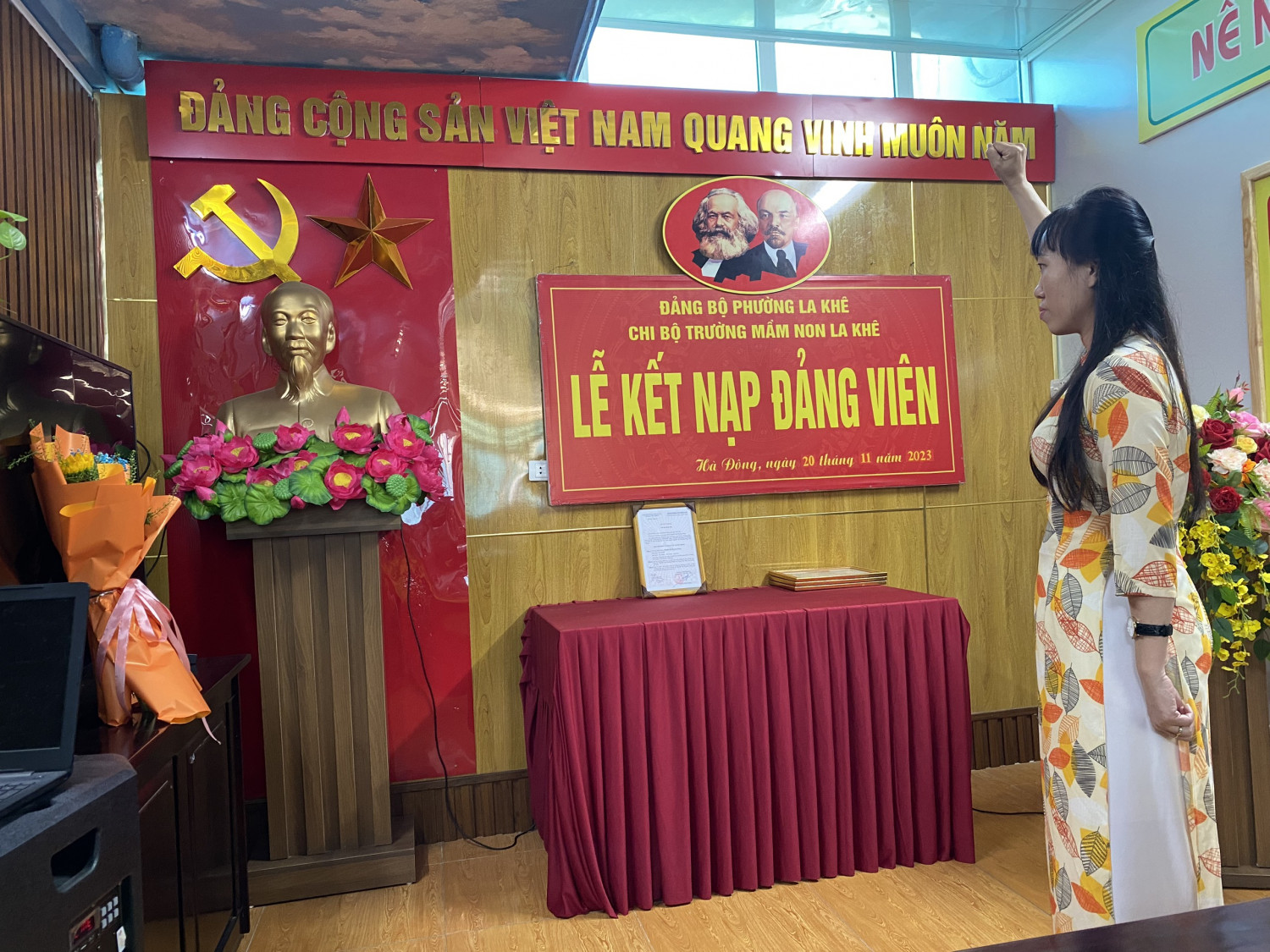 Thực hiện Nghị quyết của Đại hội Chi bộ Trường MN La Khê nhiệm kỳ 2022 - 2025 về công tác XD Đảng và phát triển Đảng viên, nhiều quần chúng ưu tú đã rèn luyện, tu dưỡng, phấn đấu để được đứng trong hàng ngũ của Đảng.