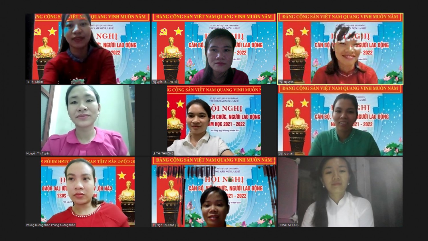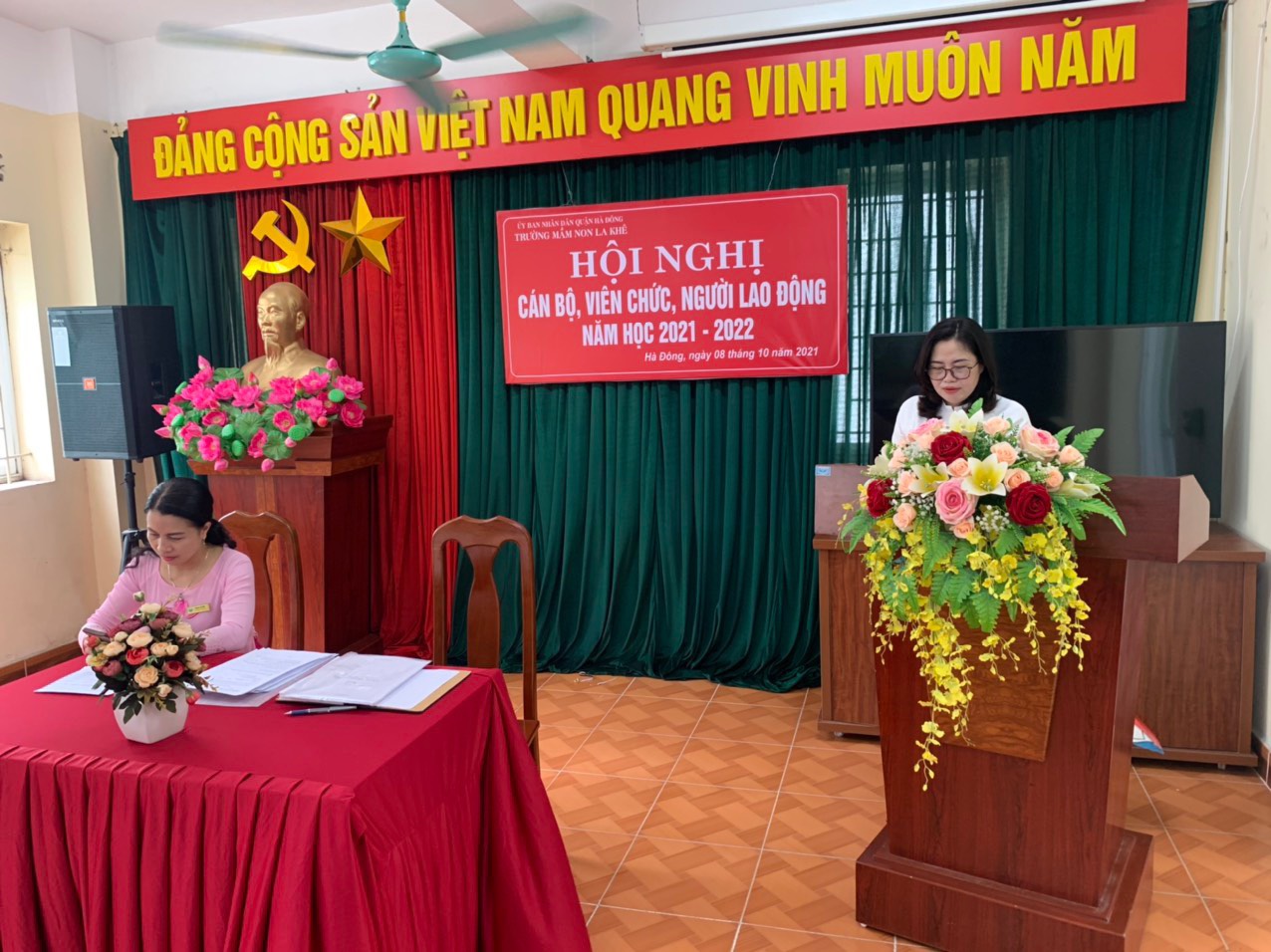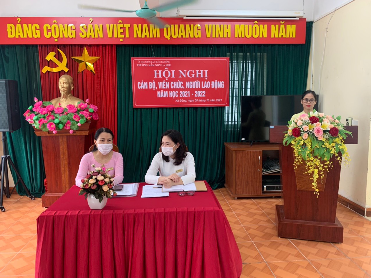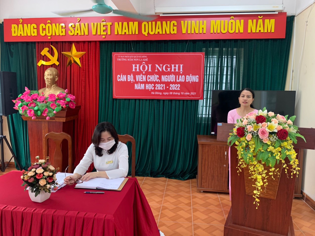 Thực hiện nhiệm vụ năm học 2021-2022, ngày 08/10/2021 Hội đồng sư phạm trường mầm non La Khê đã long trọng tổ chức Hội nghị cán bộ, viên chức, người lao động năm học 2021-2022. Hội nghị đã diễn ra thành công tốt đẹp qua hình thức trực tiếp kết hợp trực tuyến. Tập thể nhà trường đã được nghe các báo cáo về kết quả thực hiện nhiệm vụ năm học 2020-2021, cùng thảo luận đóng góp ý kiến với tinh thần trách nhiệm và sự nhất trí cao về phương hướng, nhiệm vụ, chỉ tiêu phấn đấu trong năm học 2021-2022. 100% các đồng chí tham dự Hội nghị cùng quyết tâm thực hiện thắng lợi Nghị quyết Hội nghị đã đề ra. Chúc cho năm học 2021-2022 thành công rực!