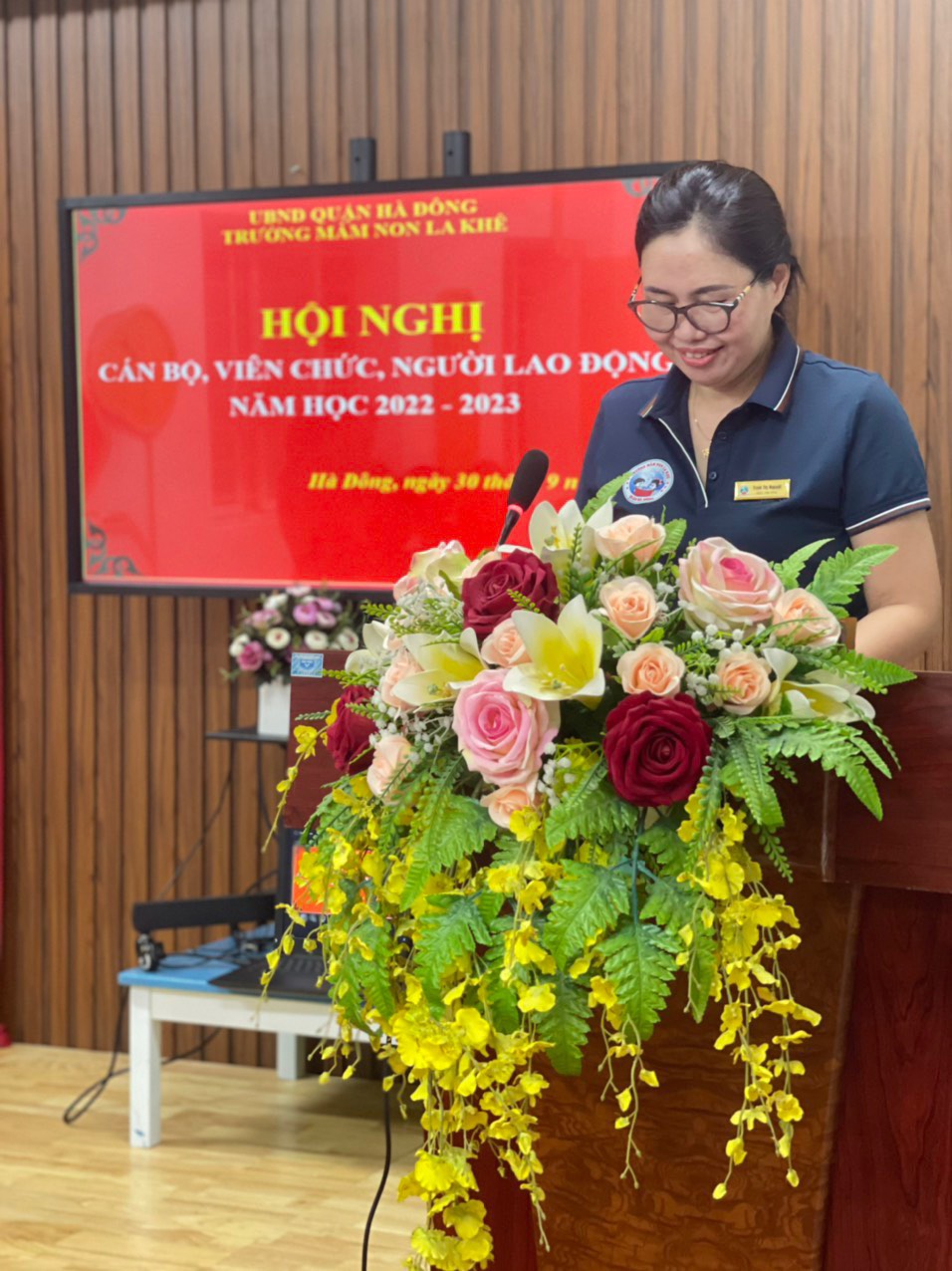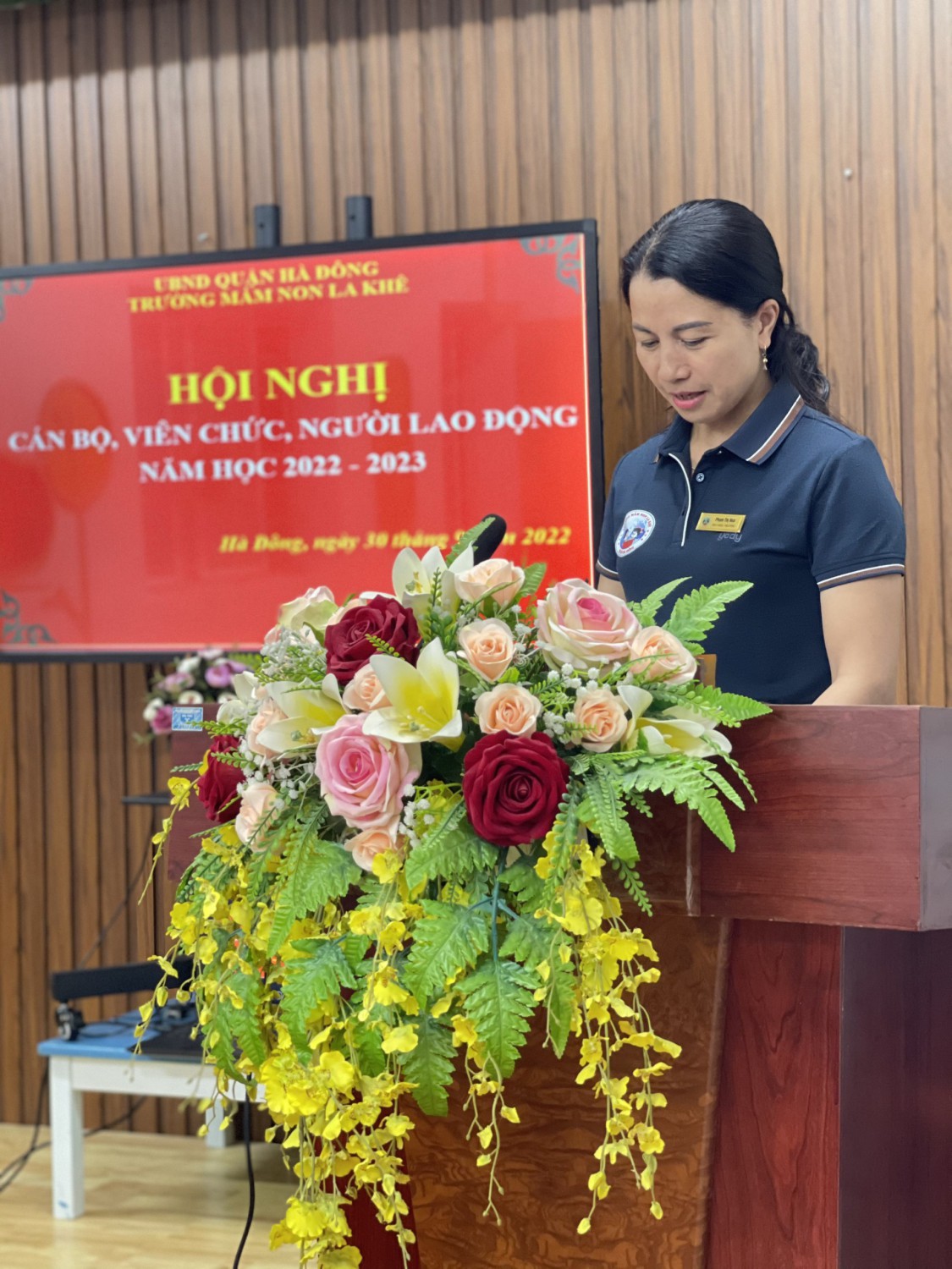 Thực hiện công văn số 89/HD-UBND- LĐLĐ ngày 02/12/2021 của UBND Quận Hà Đông- Liên đoàn Lao động Quận về việc tổ chức Hội nghị CBCC, VC, người lao động năm học 2022- 2023. Ngày 30/9/2022, trường MN La Khê long trọng tổ chức Hội nghị Cán bộ, viên chức, người lao động năm học 2022-2023.