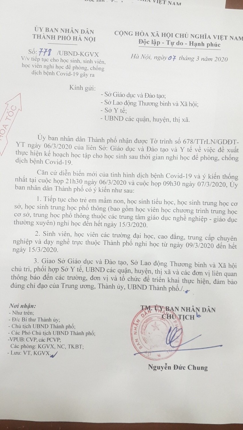 Do tình hình dịch bệnh diễn biến phức tạp, để đảm bảo an toàn cho học sinh, Chủ tịch UBND thành phố Hà Nội Nguyễn Đức Chung đã ra quyết định cho học sinh tất cả các trường học trên địa bàn thành phố Hà Nội tiếp tục nghỉ học từ ngày 09/03/2020 đến 15/03/2020.