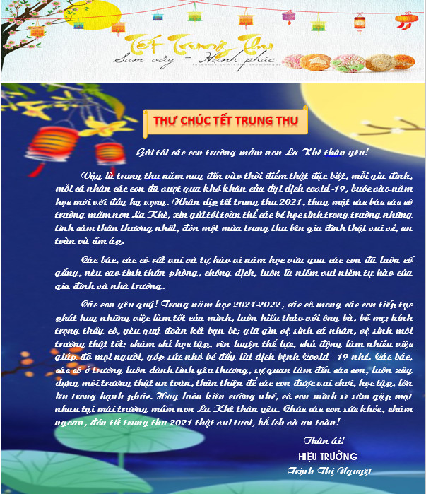 Thư chúc mừng của cô Trịnh Thị Nguyệt - Hiệu trưởng trường mầm non La Khê gửi tới các bé yêu nhân ngày tết trung thu!