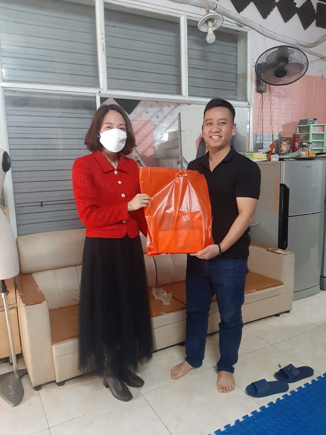 Cô Trần Thị Hồng Thúy - Phó hiệu trưởng nhà trường trao quà cho gia đình cháu Nguyễn Minh Thư - học sinh lớp C3