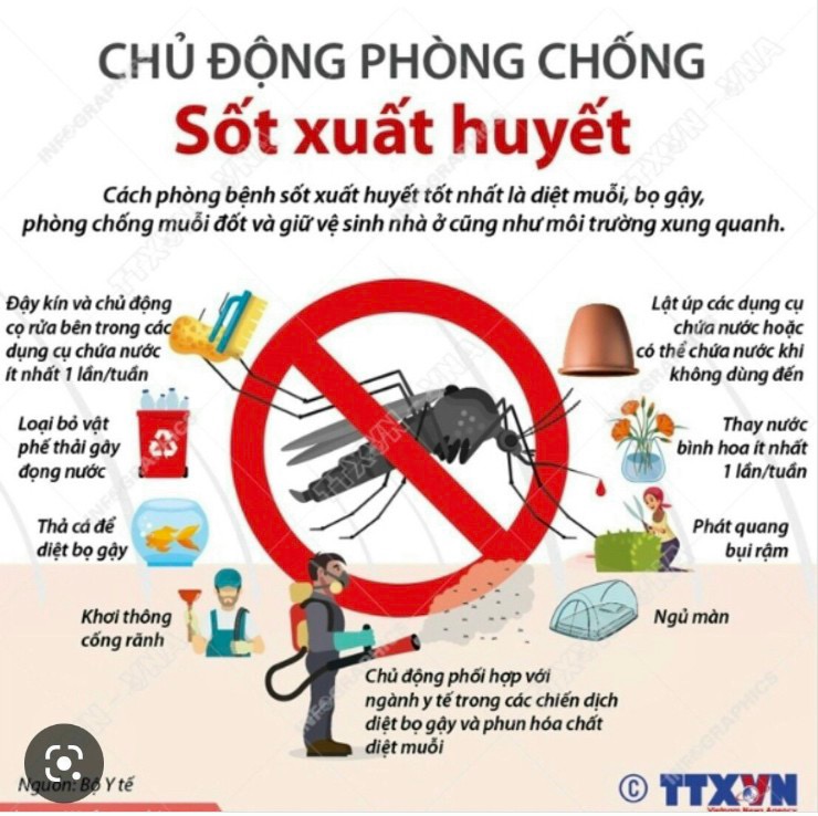 I. Bệnh sốt xuất huyết là gì? - Sốt xuất huyết là bệnh truyền nhiễm cấp tính, có thể gây thành dịch do vi rút dengue gây ra. Bệnh lây lan do muỗi vằn đốt người bệnh nhiễm vi rút sau đó truyền bệnh cho người lành qua vết đốt. - Ở Việt Nam, bệnh lưu hành rất phổ biến, ở cả 4 miền Bắc, Trung, Nam và Tây Nguyên, bệnh xảy ra quanh năm nhưng thường bùng phát thành dịch lớn vào mùa mưa, nhất là vào các tháng 7,8, 9, 10. II. Sự nguy hiểm của bệnh sốt xuất huyết: - Bệnh chưa có thuốc điều trị đặc hiệu và chưa có vắc xin phòng bệnh. - Thường gây ra dịch lớn với nhiều người mắc có thể gây tử vong nhất là với trẻ em, gây thiệt hại lớn về kinh tế, xã hội. - Bệnh sốt xuất huyết do vi rút Dengue gây ra với 4 típ gây bệnh, một người có thể mắc nhiều lần do nhiễm các typ vi rút Dengue khác nhau. III. Đặc điểm của muỗi truyền bệnh sốt xuất huyết: - Muỗi có màu đen, thân và chân có những đốm trắng thường được gọi là muỗi vằn. - Muỗi vằn cái đốt người vào ban ngày, đốt mạnh nhất là vào sáng sớm và chiều tối. - Muỗi vằn thường trú đậu ở các góc/xó tối trong nhà, trên quần áo đặc biệt quần áo có mùi mồ hôi, chăn màn, dây phơi và các đồ dùng trong nhà. - Muỗi vằn đẻ trứng, sinh sản ở các ao, vũng nước hoặc các dụng cụ chứa nước sạch ở trong và xung quanh nhà như bể nước, chum, vại, xô, chậu, giếng nước, hốc cây, hòn non bộ... các đồ vật hoặc đồ phế thải có chứa nước như lọ hoa, bát nước kê chạn, lốp xe, vỏ dừa, vỏ sữa chua, máng thoát nước mưa bị tắc...Muỗi vằn phát triển mạnh vào mùa mưa, khi nhiệt độ trung bình hàng tháng vượt trên 20º C. IV. Biểu hiện của bệnh sốt xuất huyết: - Sốt cao đột ngột 39 - 40 độ C, kéo dài 2 - 7 ngày. - Đau đầu dữ dội ở vùng trán. - Đau hốc mắt, đau người, các khớp - Buồn nôn - Phát ban - Xuất huyết: dưới da, chảy máu mũi, ra kinh nguyệt bất thường, xuất huyết tiệu hóa…. V. Nguyên nhân tử vong: - Shock do thoát dịch ra khỏi lòng mạch máu - Xuất huyết nội tạng: tim, não, thận, xuất huyết tiêu hóa… VI. Cần làm gì khi nghi ngờ bị sốt xuất huyết: 1. Đi khám tại cơ sở y tế để chẩn đoán và điều trị theo đơn bác sĩ; khám lại theo hẹn 2. Theo dõi và chăm sóc tại cộng đồng: - Hạ sốt khi nhiệt độ cơ thể từ 38,5 độ C trở lên bằng Paracetamol, lau người bằng nước ấm khi sốt cao - Uống nhiều nước: dung dịch Oresol, nước trái cây… - Ăn thức ăn lỏng, dễ tiêu: Cháo, súp, sữa, thực phẩm giàu vitamin C - Nằm màn cả ngày và đêm, nghỉ ngơi tại giường - Theo dõi hàng ngày các triệu chứng cho đến khi hết sốt 2 ngày 3. Đến ngay cơ sở y tế khi có các dấu hiệu nguy hiểm sau: • Mệt mỏi bất thường, nhiệt độ hạ nhanh dưới 36C; da xanh, lạnh và ẩm • Chảy máu mũi hoặc chảy máu lợi, Có nhiều nốt xuất huyết trên da • Nôn liên tục hoặc nôn ra máu • Đi ngoài phân đen • Ngủ li bì hoặc quấy khóc (trẻ em) • Đau bụng • Khát nhiều (khô miệng) • Khó thở VII. Cách phòng bệnh sốt xuất huyết: Cách phòng bệnh tốt nhất: là diệt muỗi, lăng quăng/bọ gậy và phòng chống muỗi đốt. - Loại bỏ nơi sinh sản của muỗi, diệt lăng quăng/bọ gậy bằng cách: + Đậy kín tất cả các dụng cụ chứa nước để muỗi không vào đẻ trứng. + Thả cá hoặc mê zô vào các dụng cụ chứa nước lớn (bể, giếng, chum, vại...) để diệt lăng quăng/bọ gậy. + Thau rửa các dụng cụ chứa nước vừa và nhỏ (lu, chum, xô chậu…) hàng tuần. + Thu gom, hủy các vật dụng phế thải trong nhà và xung quanh nhà như chai, lọ, mảnh chai, mảnh lu vỡ, ống bơ, vỏ dừa, lốp/vỏ xe cũ, hốc tre, bẹ lá..., dọn vệ sinh môi trường, lật úp các dụng cụ chứa nước khi không dùng đến. + Bỏ muối hoặc dầu vào bát nước kê chân chạn/tủ đựng chén bát, thay nước bình hoa/bình bông. - Phòng chống muỗi đốt: + Mặc quần áo dài tay. + Ngủ trong màn/mùng kể cả ban ngày. + Dùng bình xịt diệt muỗi, hương muỗi, kem xua muỗi, vợt điện diệt muỗi... + Dùng rèm che, màn tẩm hóa chất diệt muỗi. + Cho người bị sốt xuất huyết nằm trong màn, tránh muỗi đốt để tránh lây lan bệnh cho người khác. - Tích cực phối hợp với chính quyền và ngành y tế trong các đợt phun hóa chất phòng chống dịch.
