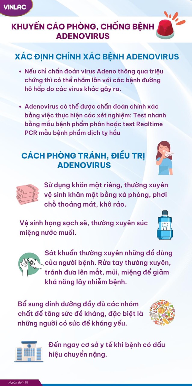 Hiện tại ở Việt Nam, chưa có vắc-xin phòng ngừa virus Adeno. Vì thế, cách tốt nhất để kiểm soát bệnh lây lan là phát hiện sớm, cảnh giác với các yếu tố lâm sàng, yếu tố dịch tễ để không bỏ lỡ xét nghiệm; tuân thủ các biện pháp dự phòng thường quy, đồng thời tuân thủ tiêm chủng các vắc-xin phòng bệnh đang sẵn có.