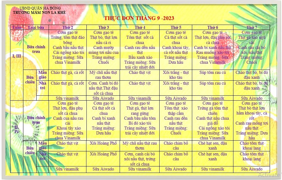 Năm học mới 2023-2024 sắp bắt đầu! Để chào đón các bé yêu đến học tại trường mầm non La Khê, Ban giám hiệu cùng đội ngũ nhân viên nuôi dưỡng nhiều năm kinh nghiệm đã dành thời gian và tâm huyết chuẩn bị một thực đơn phong phú với đầy đủ chất dinh dưỡng cho các bé. Đến với trường mầm non La Khê mỗi ngày đến trường với bé sẽ là một ngày vui!