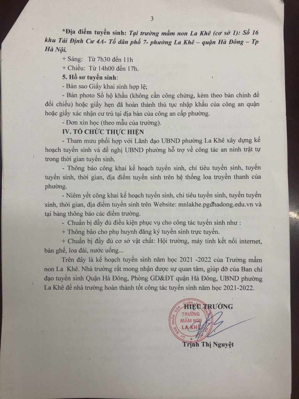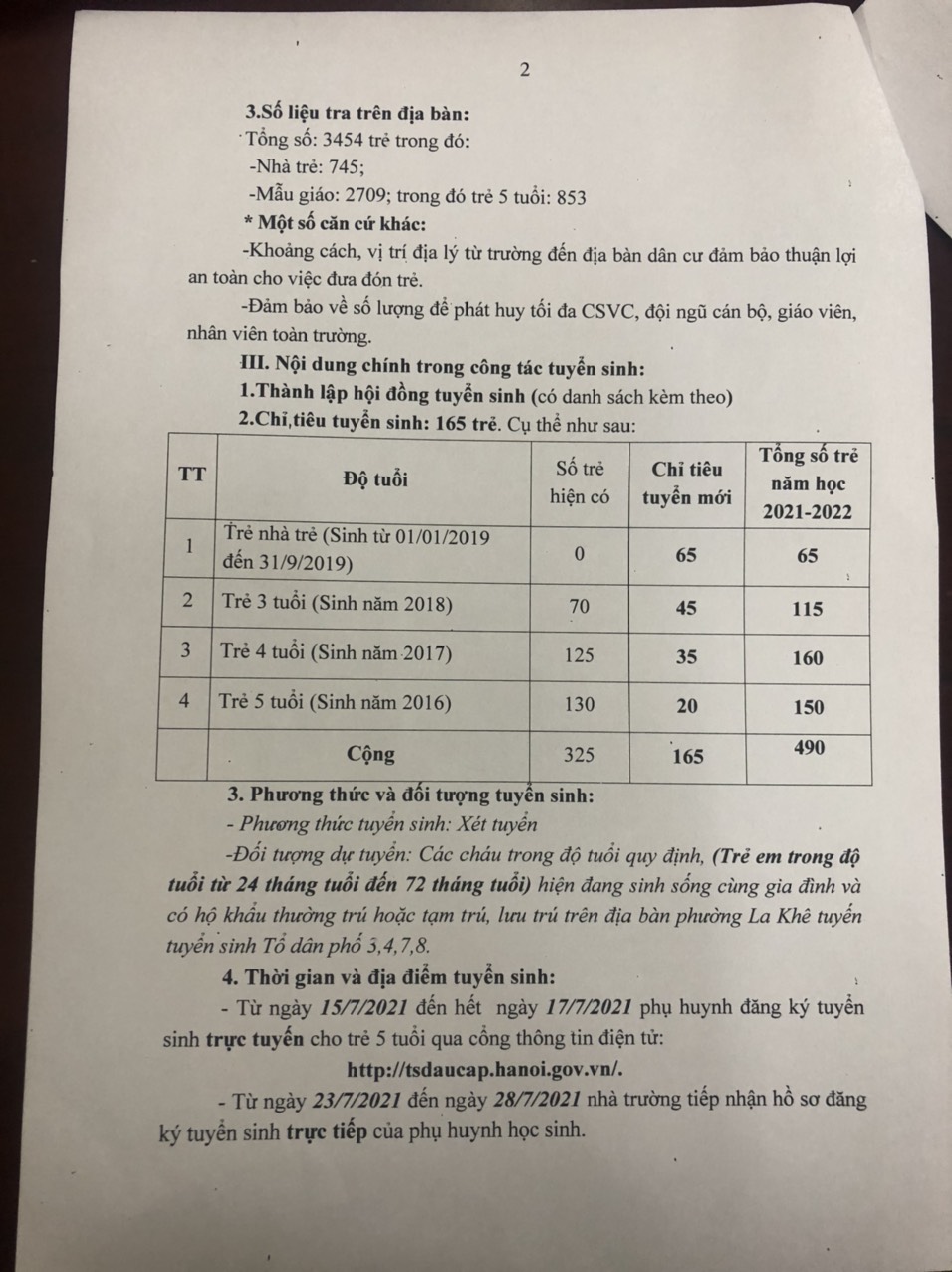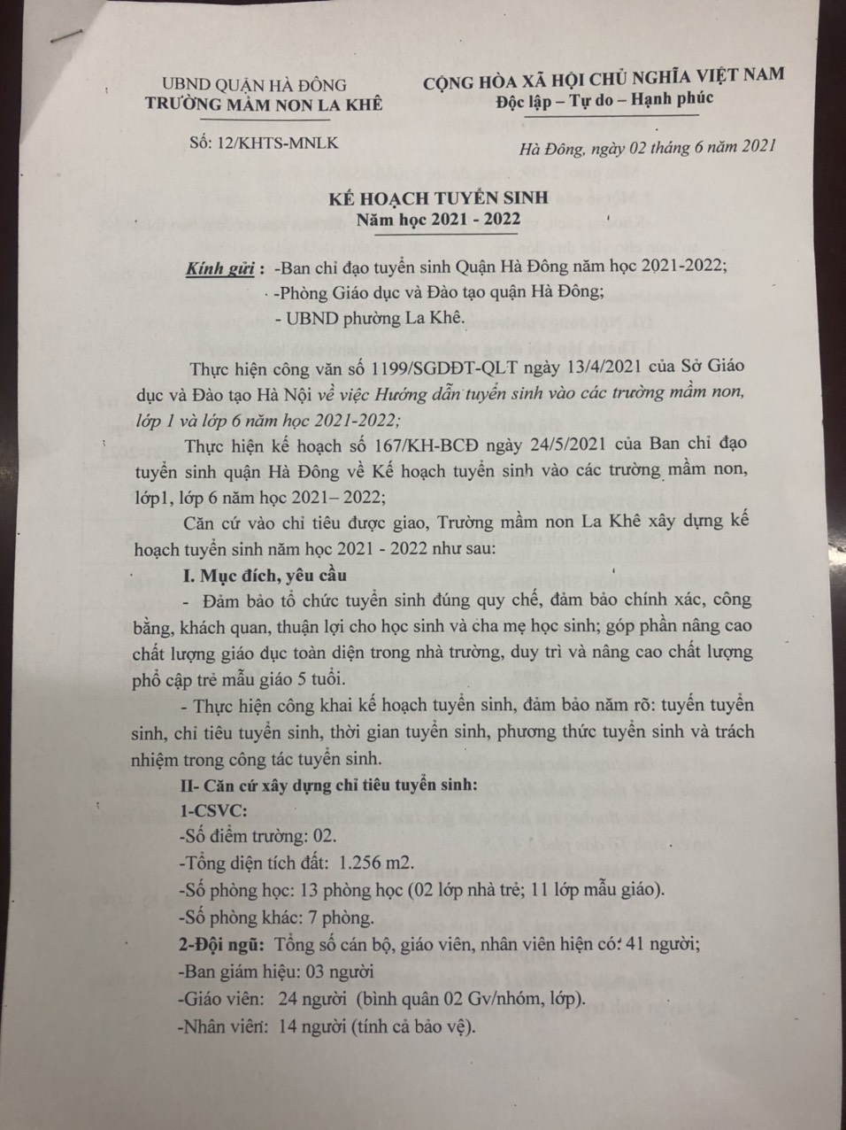 TRƯỜNG MẦM NON LA KHÊ THÔNG BÁO KẾ HOẠCH TUYỂN SINH NĂM HỌC 2021-2022