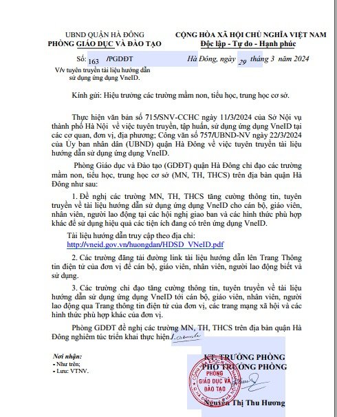 Thực hiện CV số 163/PGDĐT ngày 29/3/2024 của Phòng giáo dục đào tạo quận Hà Đông về việc tuyên truyền tài liệu hướng dẫn sử dụng VneID, Trường MN La Khê gửi tới các đồng chí CBGVNV đường link tài liệu hướng dẫn để truy cập và biết cách sử dụng.